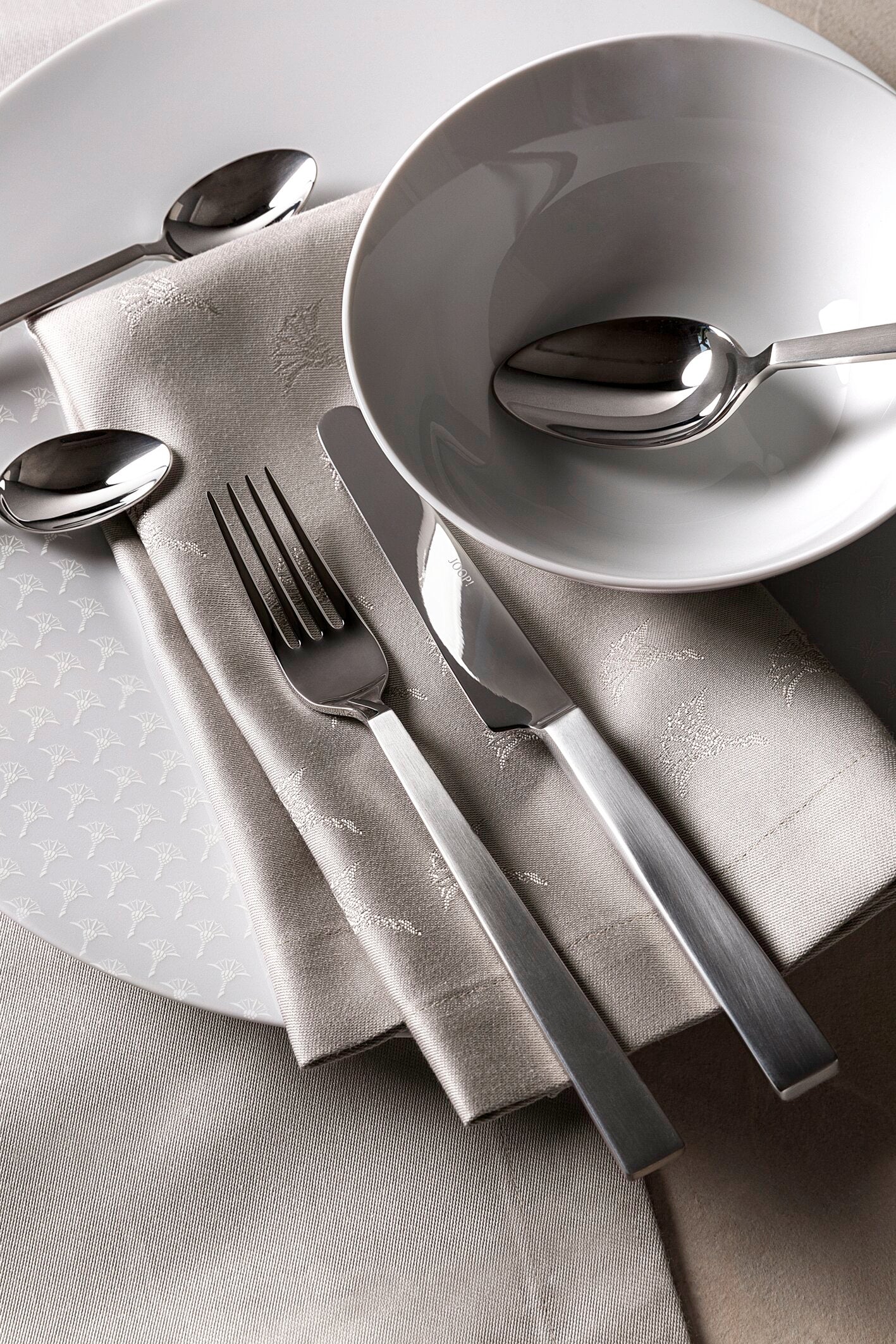 Zwei kontrastierende Dekor-Linien inszenieren das legendäre Marken-Signet, die Kornblume, auf virtuose Weise. Unterschiedlich kombinierbar sind die textilen Sortimente wie Servietten, Sets, Tischläufer und Tischdecken in klassischen oder saisonalen Farben und dazu passenden Tischaccessoires wie Kerzen. Auf allen Produkten der Kollektion dokumentiert ein zurückhaltend gesetztes JOOP! Label den hohen Anspruch der Marke an Qualität und Design. Der Zusatz „Made in Germany“ zeigt die intensive Entwicklung und Fertigung in Deutschland.