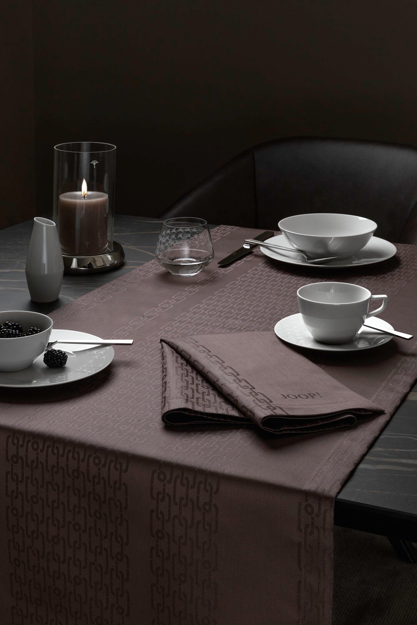 Hochwertig verarbeiteter JOOP! CHAINS Tischläufer in Halbzwirn-Qualität mit Baumwoll-Anteil und elegantem JOOP! Ketten-Muster. Dining in style: JOOP! DINING GLAMOUR umfasst ein komplettes Tafelservice, eine Bestecklinie, Kristallgläser sowie Tischwäsche, die dank prägnanter Linienführung die richtige Balance zwischen selbstbewusstem Charakter und subtiler Eleganz finden. Umgesetzt wird das ikonische Design in hochwertigen Materialien wie feinstem Porzellan, glänzendem oder satiniertem Edelstahl und transparent dekoriertem Kristallglas.