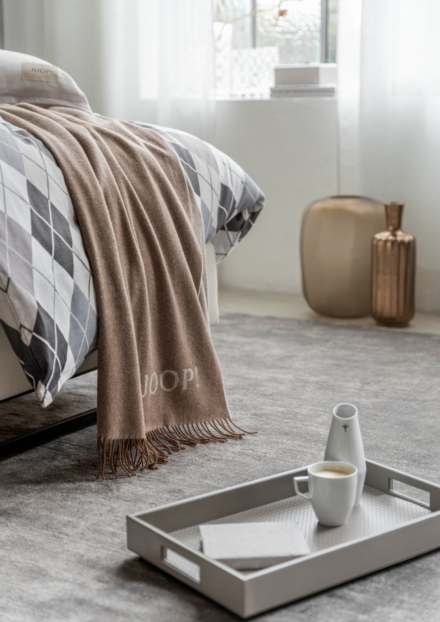 Modern Glamour auf den Punkt gebracht: Dafür steht JOOP! LIVING. Die Home-Linie des international bekannten deutschen Lifestyle-Labels JOOP! hat sich vom Anbieter luxuriöser Wohntextilien zur umfassenden Möbel- und Accessoire-Kollektion entwickelt, die hochklassige Produkte für nahezu alle Interior-Bereiche präsentiert. Vielseitige Möbel treffen auf dekorative Accessoires. Mal pur und minimalistisch, mal mit einem Hauch Extravaganz. Die Bereiche LIVING ROOM, DINING ROOM, BEDROOM und BATHROOM sprechen dieselbe Designsprache und verschmelzen zu harmonischen Wohnwelten. Abwechslungsreich akzentuiert durch die Farben, Muster und Trends der aktuellen Saison, die sich auf Dekokissen, Wohndecken, Tischwäsche, Bettwäsche, Frottier oder Badteppichen wiederfinden.