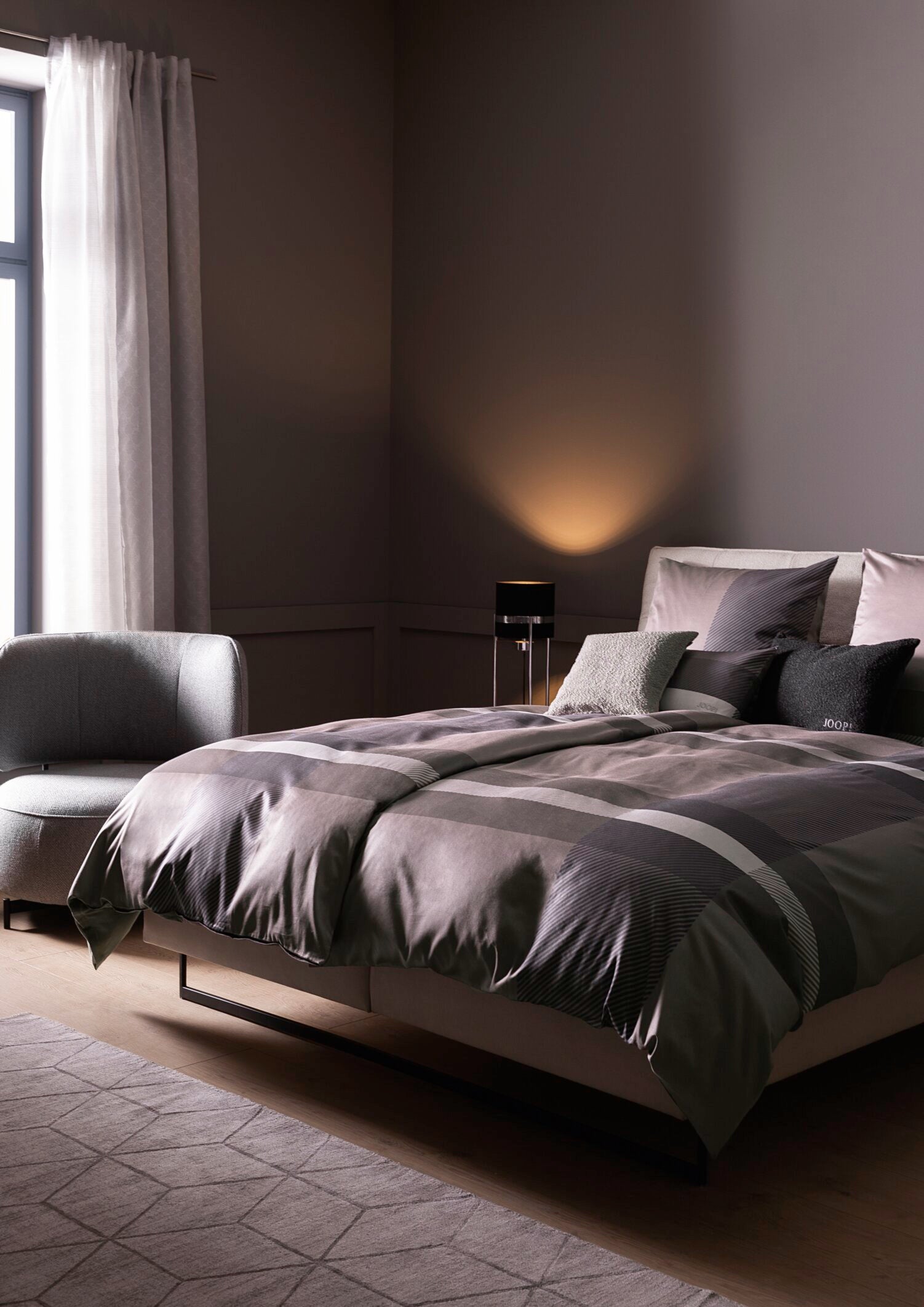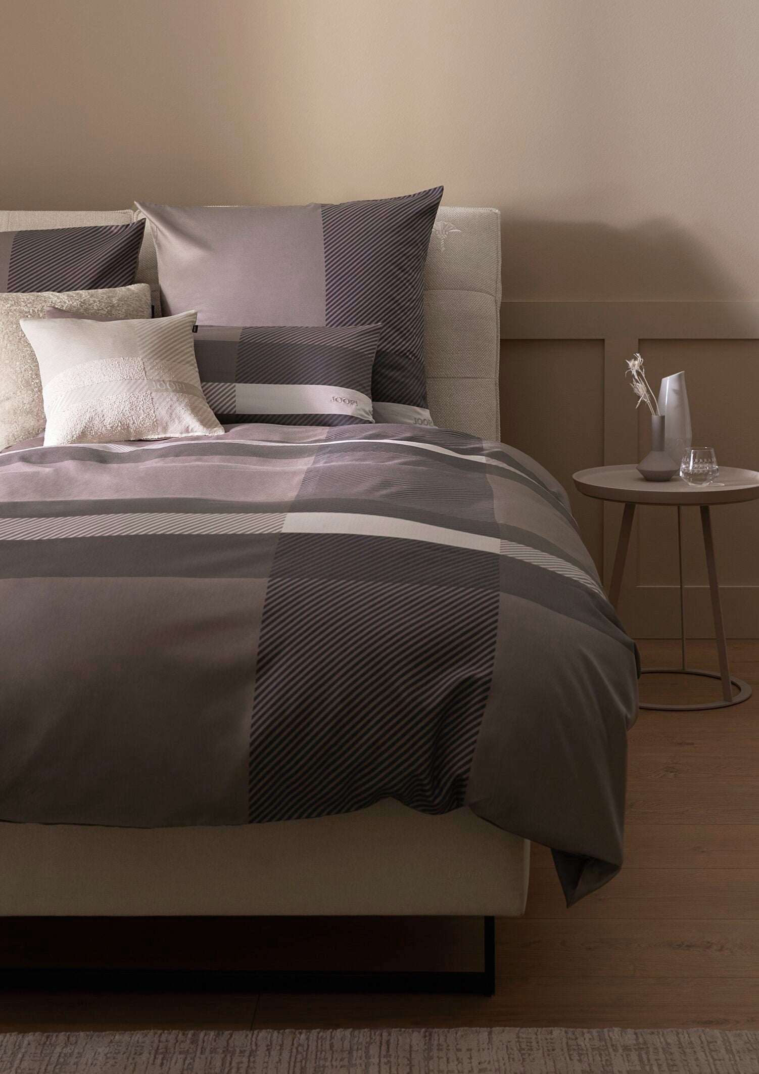 Edle JOOP! MODERN Bettwäsche aus hochwertig verarbeitetem Comfort-Satin mit modern interpretiertem und mehrfarbigem Karo-Muster sowie gesticktem JOOP! Logo. Die JOOP! Bettwäsche überzeugt durch ihre luxuriöse Qualität und ihr einzigartiges Design: Hochwertigste ägyptische Baumwolle bildet die Grundlage für die besonders feinen Garne, die zu seidigem Comfort-Satin verarbeitet werden. Nach verschiedenen Veredelungs- und Ausrüstungsschritten wird die Ware in Deutschland konfektioniert – in hochwertiger Verarbeitung, mit verdeckten, farblich angepassten Reißverschlüssen und anderen handwerklichen Details. Das fertig konfektionierte Produkt wird handgebügelt und dabei einer sorgfältigen Qualitätsendkontrolle unterworfen.