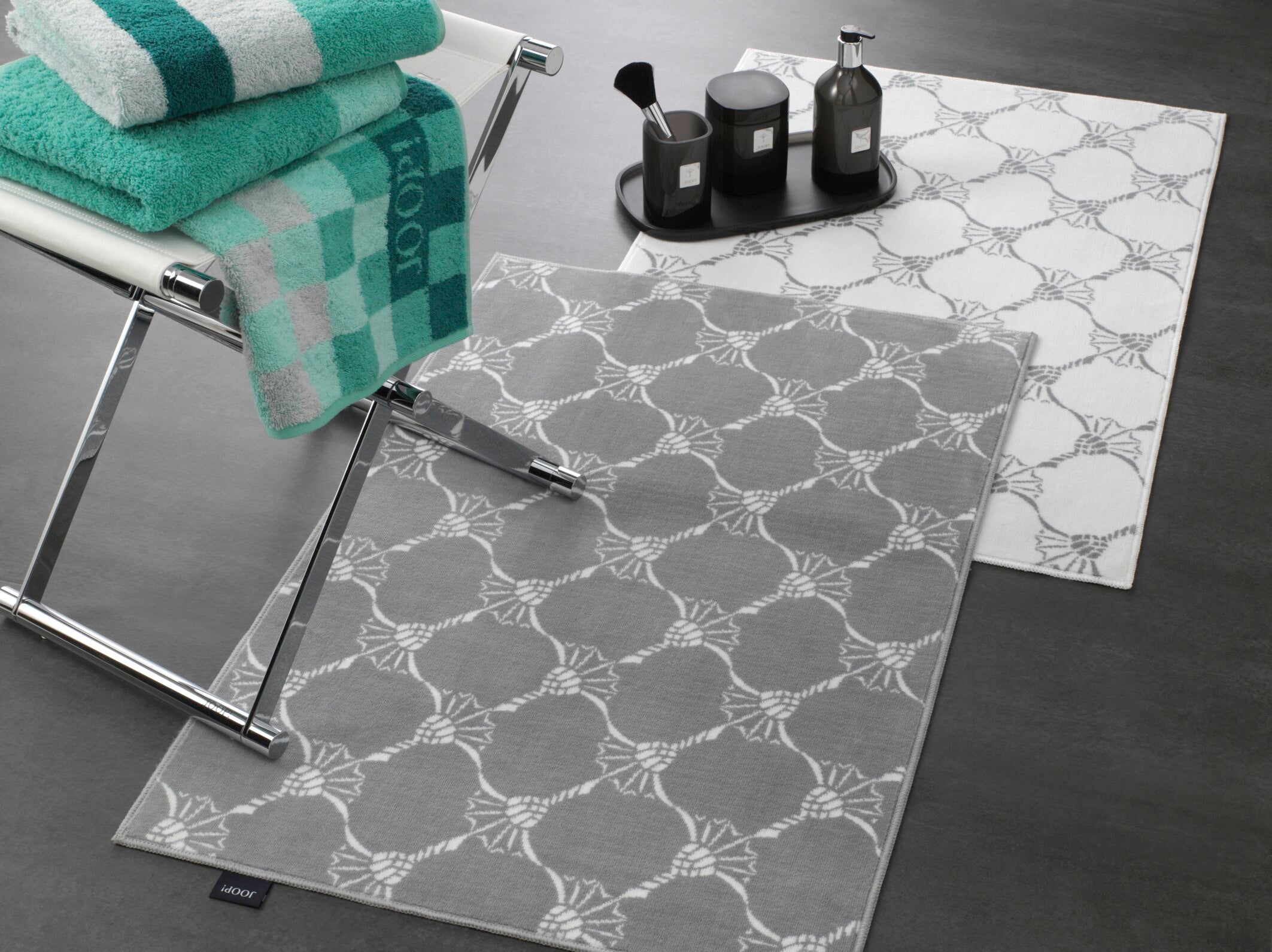Feiner JOOP! REPETITION Badteppich aus 100% Baumwolle mit Kornblumen-Allover-Muster in Kontrastfarbe. Das Must-have für den privaten Bad-Bereich: Die JOOP! Badteppiche sorgen mit niedrigem und hohem Flor für erholsame Wellness-Momente im eigenen Bad und komplettieren die persönliche Relax-Zone. Made in Germany überzeugen die Vorleger mit handwerklicher Präzision und der klassischen JOOP! Signatur.