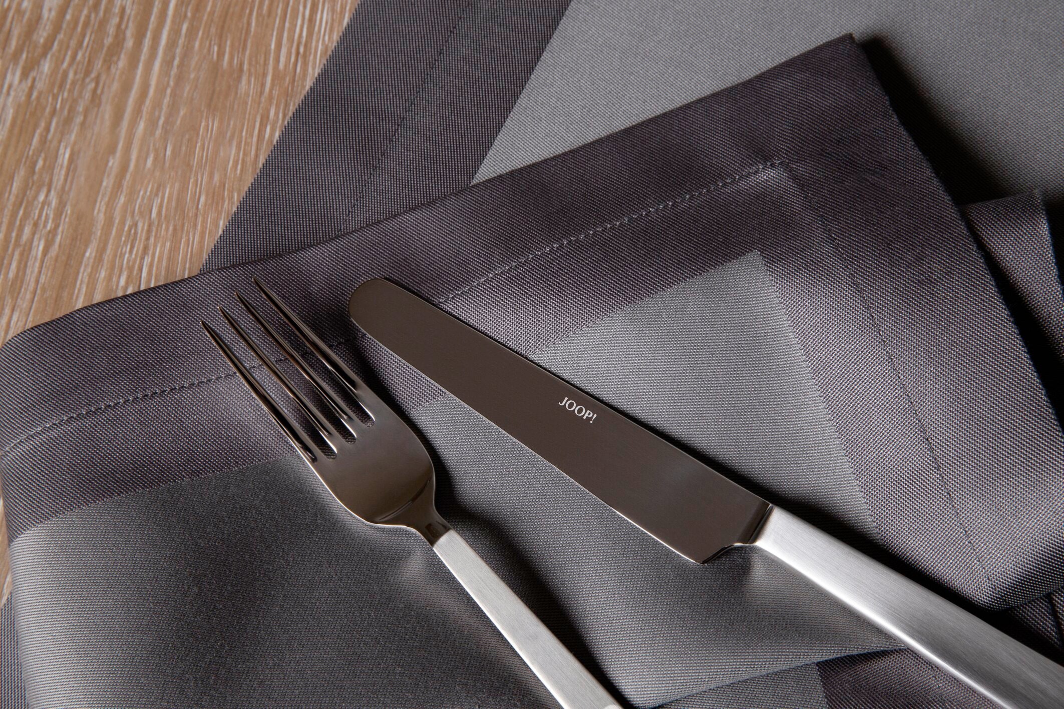 Hochwertig verarbeitete JOOP! SIGNATURE Servietten in Halbzwirn-Qualität mit Baumwoll-Anteil und JOOP! Logo-Signatur. Dining in style: JOOP! DINING GLAMOUR umfasst ein komplettes Tafelservice, eine Bestecklinie, Kristallgläser sowie Tischwäsche, die dank prägnanter Linienführung die richtige Balance zwischen selbstbewusstem Charakter und subtiler Eleganz finden. Umgesetzt wird das ikonische Design in hochwertigen Materialien wie feinstem Porzellan, glänzendem oder satiniertem Edelstahl und transparent dekoriertem Kristallglas.