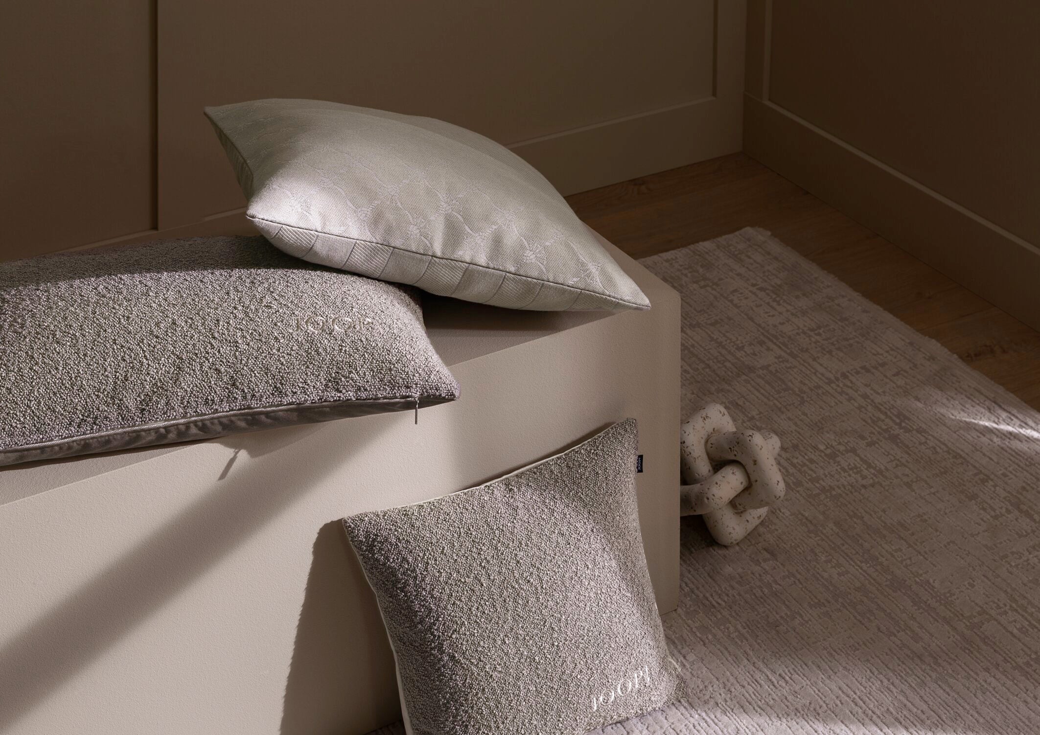 Elegante JOOP! TOUCH Zierkissenhülle aus hochwertig verarbeitetem Bouclé-Stoff mit gestickter JOOP! Logo-Signatur und samtiger Uni-Rückseite. Edle Blickfänger für zu Hause: Die Dekokissen der JOOP! HOME DECOR Kollektion überzeugen durch einen besonders hohen Qualitätsanspruch und mit exklusiven Dessins. Unter Verarbeitung hochwertiger Materialien entstehen in aufwändigen Produktionsprozessen elegante Kissenhüllen, die eine edle Wohlfühlatmosphäre schaffen.