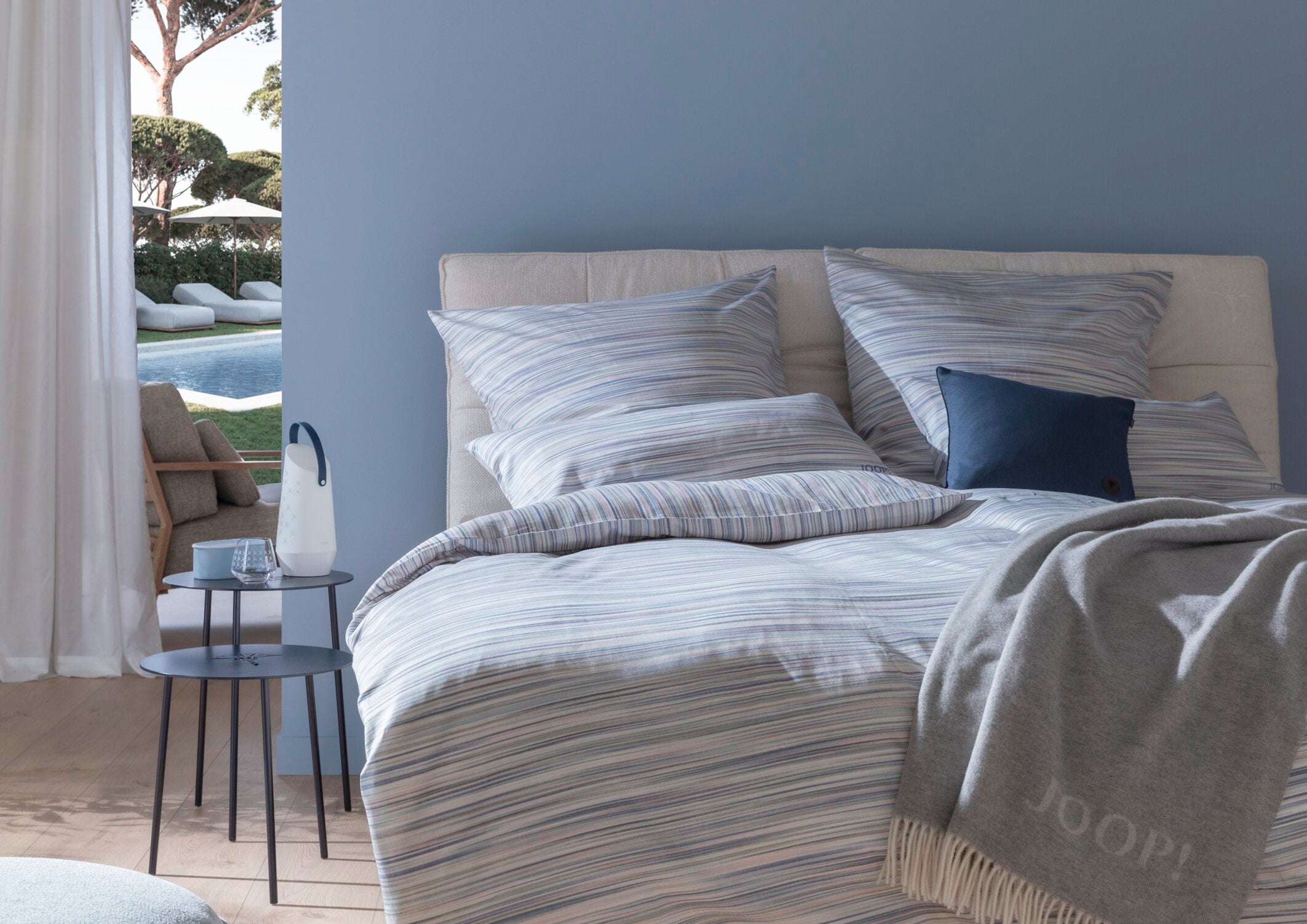 Modern Glamour auf den Punkt gebracht: Dafür steht JOOP! LIVING. Die Home-Linie des international bekannten deutschen Lifestyle-Labels JOOP! hat sich vom Anbieter luxuriöser Wohntextilien zur umfassenden Möbel- und Accessoire-Kollektion entwickelt, die hochklassige Produkte für nahezu alle Interior-Bereiche präsentiert. Vielseitige Möbel treffen auf dekorative Accessoires. Mal pur und minimalistisch, mal mit einem Hauch Extravaganz. Die Bereiche LIVING ROOM, DINING ROOM, BEDROOM und BATHROOM sprechen dieselbe Designsprache und verschmelzen zu harmonischen Wohnwelten. Abwechslungsreich akzentuiert durch die Farben, Muster und Trends der aktuellen Saison, die sich auf Dekokissen, Wohndecken, Tischwäsche, Bettwäsche, Frottier oder Badteppichen wiederfinden.